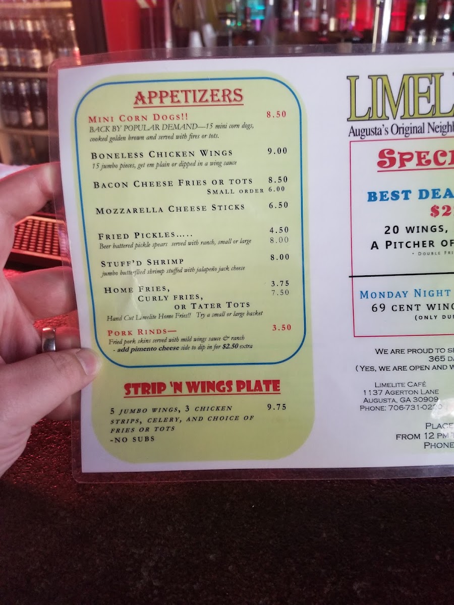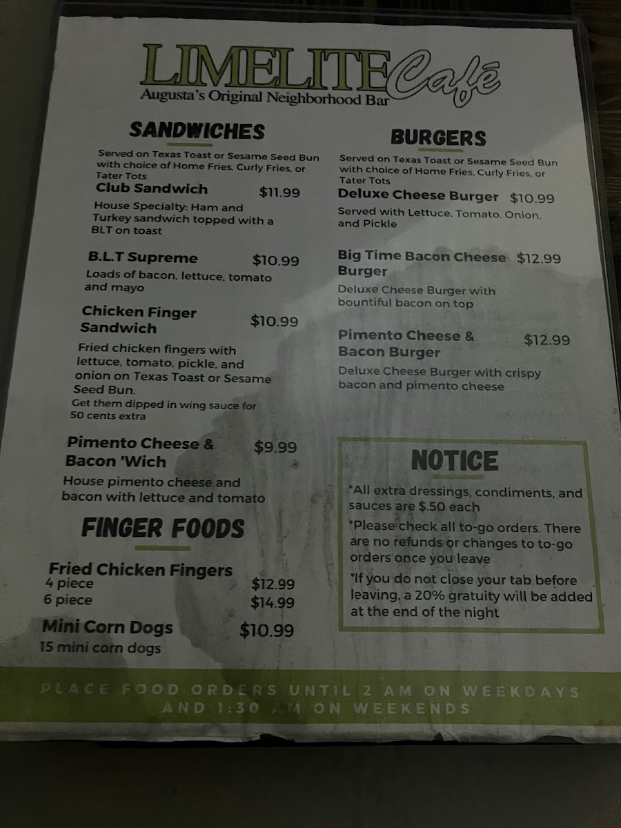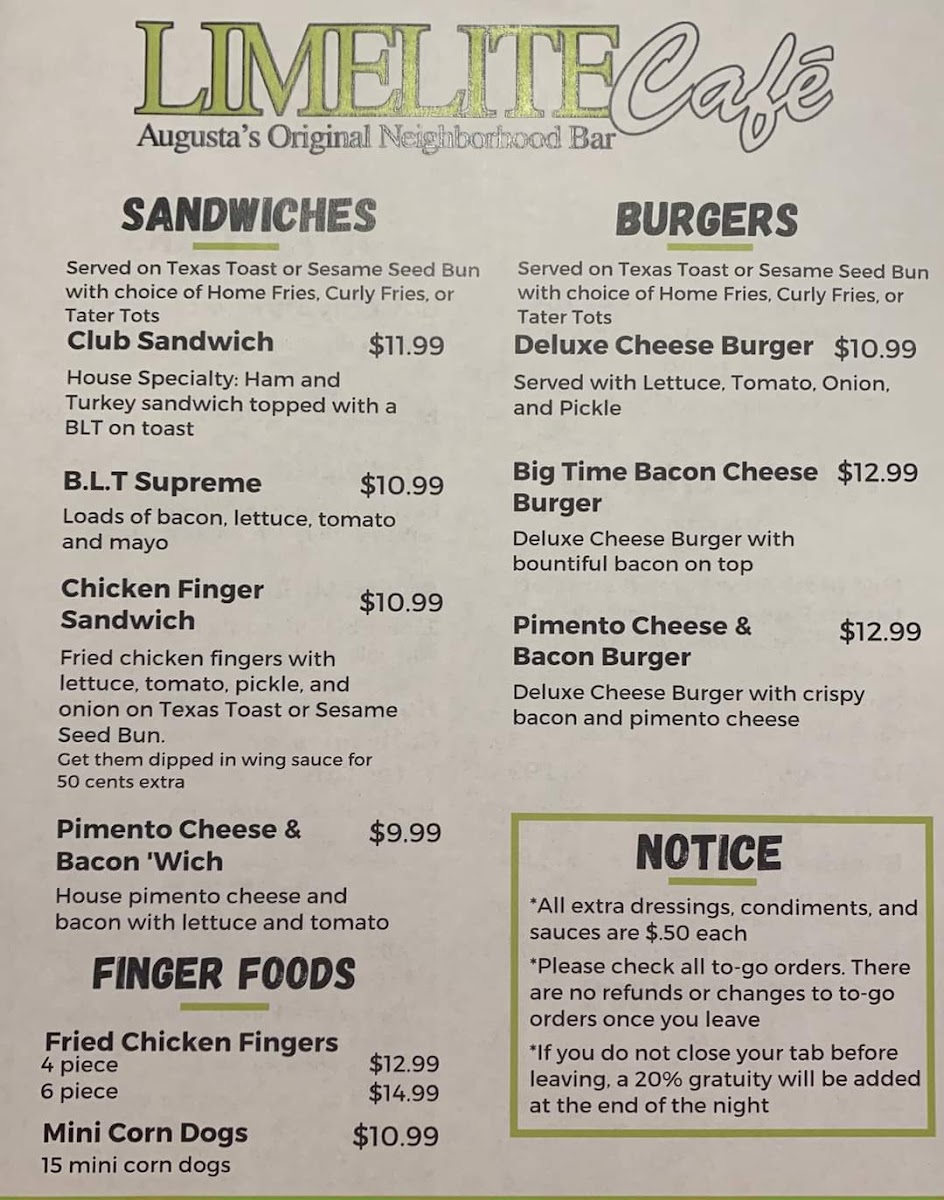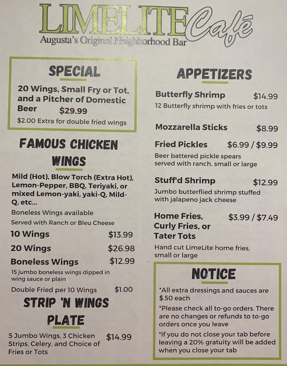 The menu at Limelite Cafe offers a variety of bar and grill options suitable for casual dining and social gatherings. Guests can choose from several categories including appetizers, sandwiches, specials, and a selection of drinks.